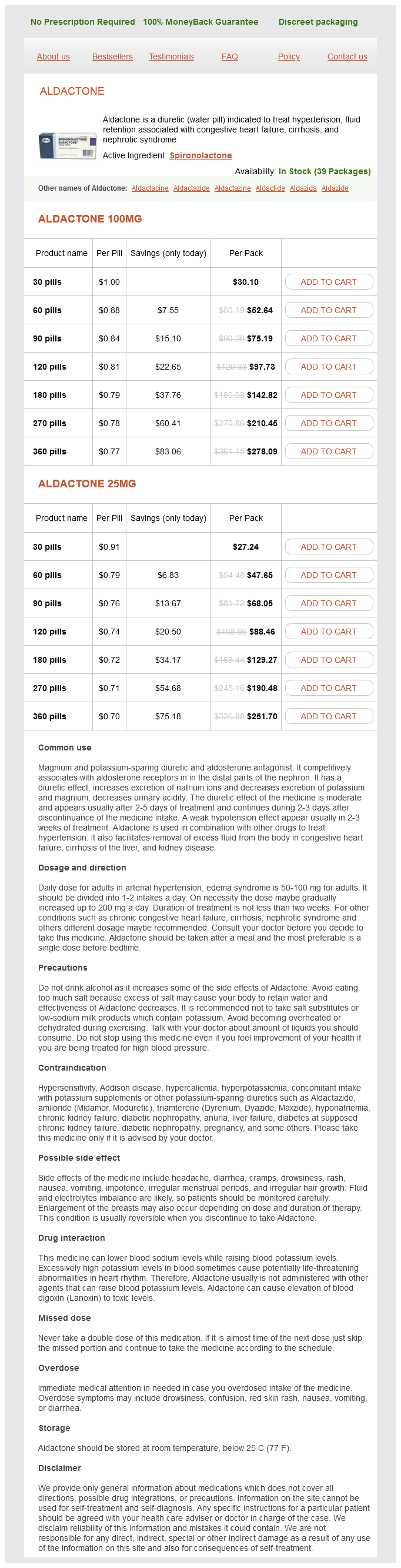 Aldactone packs: 30 pills, 60 pills, 90 pills, 120 pills, 180 pills, 270 pills, 360 pills
