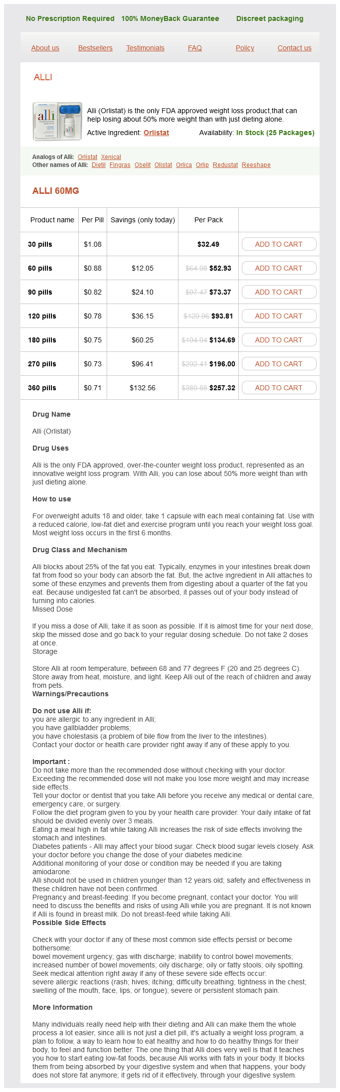 Alli packs: 30 pills, 60 pills, 90 pills, 120 pills, 180 pills, 270 pills, 360 pills