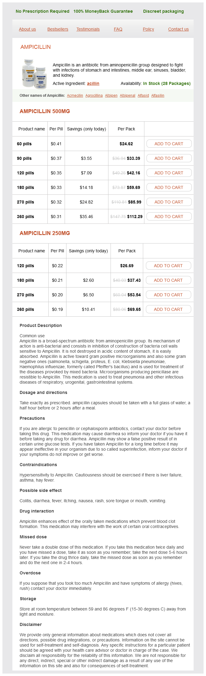 Ampicillin packs: 60 pills, 90 pills, 120 pills, 180 pills, 270 pills, 360 pills