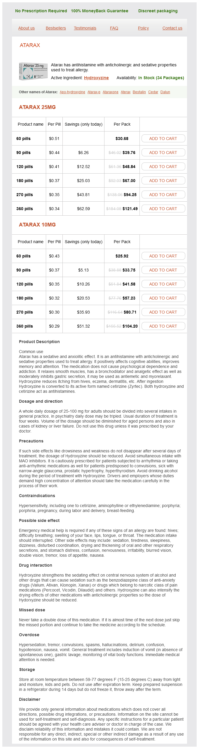 Atarax packs: 60 pills, 90 pills, 120 pills, 180 pills, 270 pills, 360 pills