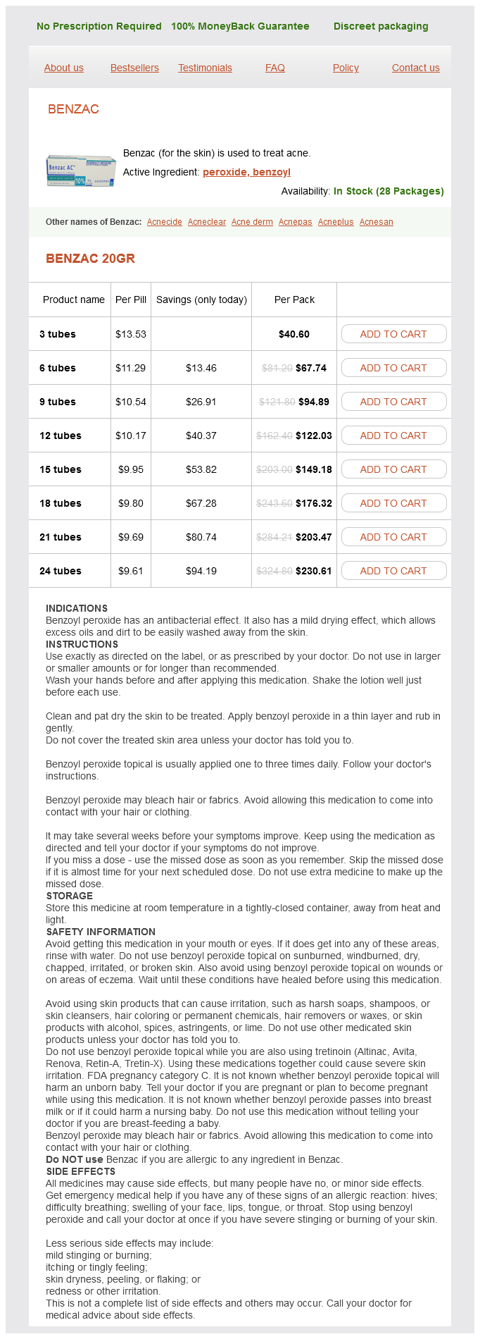 Asymptomatic hyperuricemia is not an independent risk factor for cardiovascular events or overall mortality in the general population of the Busselton Health Study skin care specialist benzac 20 gr buy with mastercard. Predictors of mortality in people with recent-onset gout: a prospective observational study. Investigation grants: Spanish Foundation for Rheumatology and Cruces Rheumatology Association. Development of preliminary remission criteria for gout using Delphi and 1000Minds(R) consensus exercises. Glycosylated hemoglobin and the risk of microalbuminuria in patients with insulin-dependent diabetes mellitus. Gycosilated hemoglobin and the risk of retinopathy in insulin-dependent diabetes-mellitus. American association of clinical endocrinologists and American College of Endocrinology Guidelines for management of dyslipemia and prevention of cardiovascular disease - executive summary. Diagnosis and management of hemochromatosis: 2011 practice guideline by the American Association for the Study of Liver Diseases. Treating rheumatoid arthritis to target: recommendations of an international task force. Treating spondyloarthritis, including ankylosing spondylitis and psoriatic arthritis, to target: recommendations of an international task force. Treat-totarget in systemic lupus erythematosus: recommendations from an international task force. Trends in gout and rheumatoid arthritis hospitalizations in the United States, 1993e2011. Improved survival in rheumatoid arthritis: a general population-based cohort study. Frequency and predictors of inappropriate management of recurrent gout attacks in a longitudinal study. Improvement of renal function in patients with chronic gout after proper control of hyperuricemia and gouty bouts. Effects of allopurinol, a xanthineoxidase inhibitor, and sulfinpyrazone upon the urinary and serum urate concentrations in eight patients with tophaceous gout. Influence of antihyperuricemic therapy on the clinical and radiographic progression of gout. Clinical efficacy and safety of successful longterm urate lowering with febuxostat or allopurinol in subjects with gout.