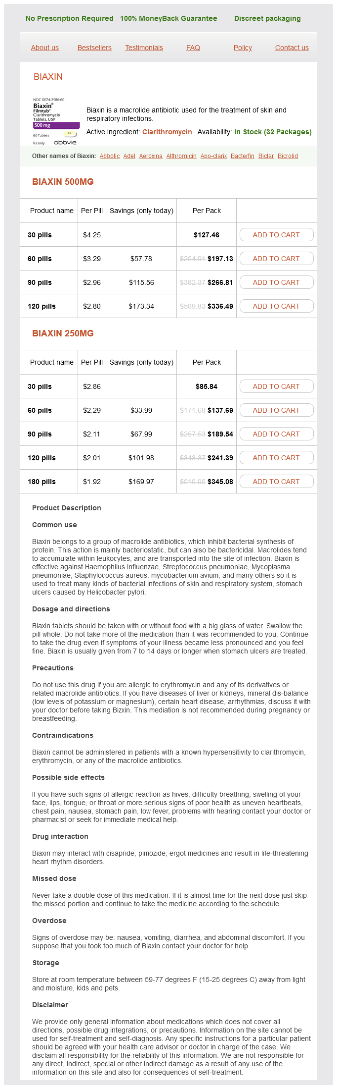 Biaxin packs: 30 pills, 60 pills, 90 pills, 120 pills, 180 pills