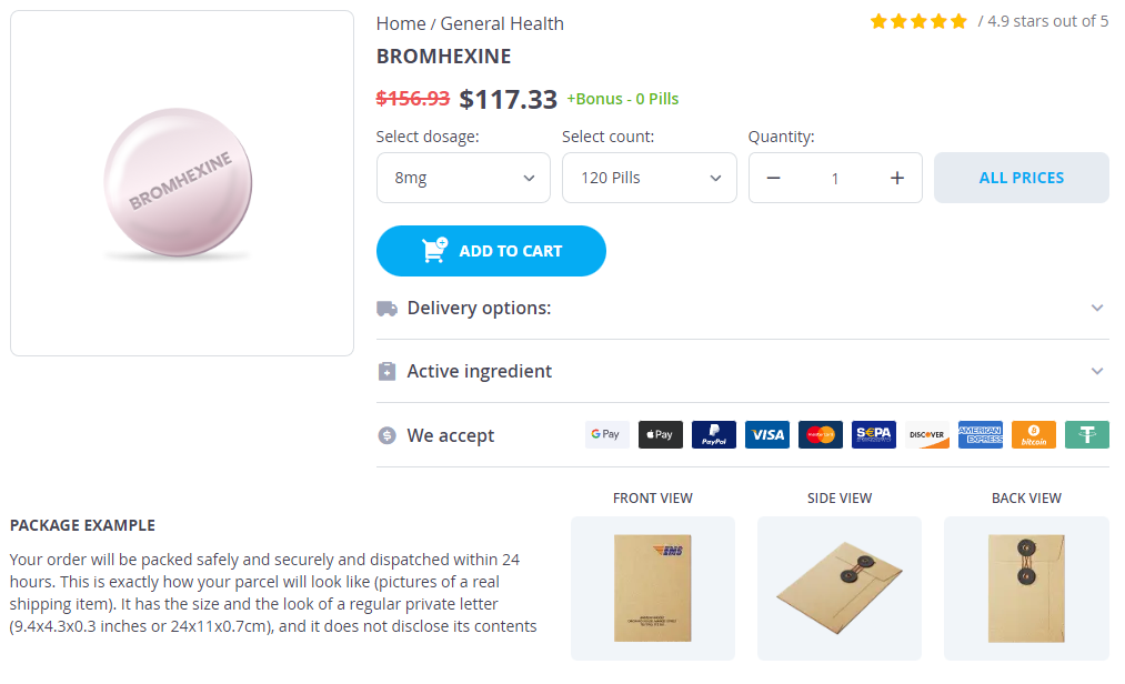 Bromhexine packs: 30 pills, 60 pills, 120 pills, 240 pills, 300 pills