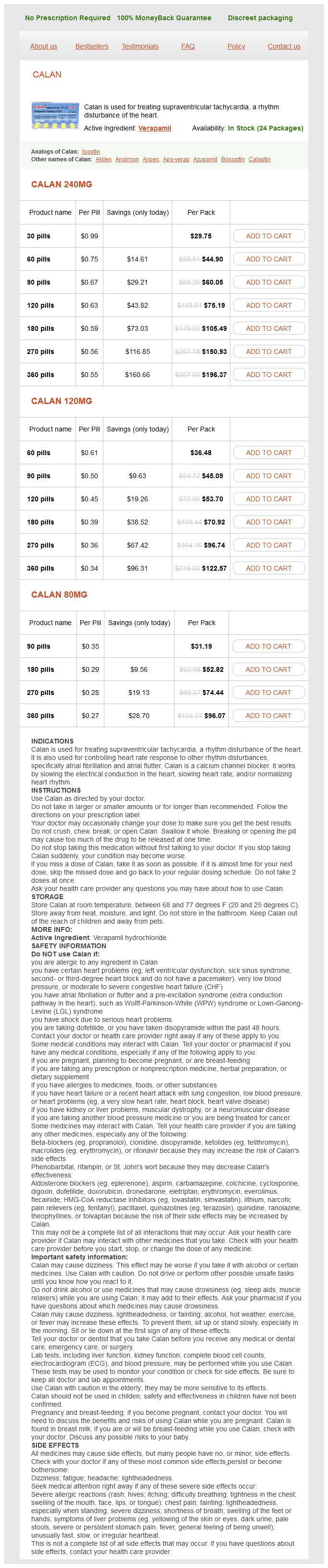 Calan packs: 30 pills, 60 pills, 90 pills, 120 pills, 180 pills, 270 pills, 360 pills