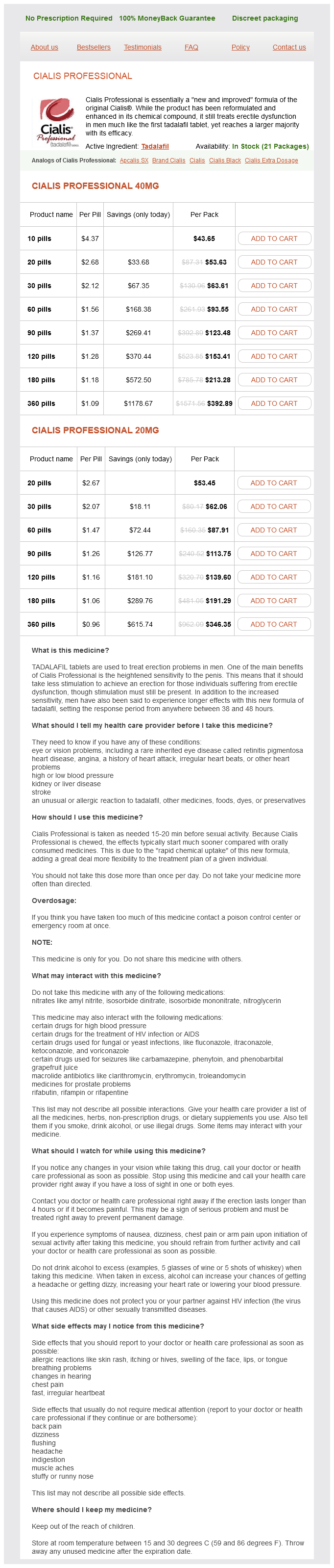 Cialis Professional packs: 10 pills, 20 pills, 30 pills, 60 pills, 90 pills, 120 pills, 180 pills, 360 pills