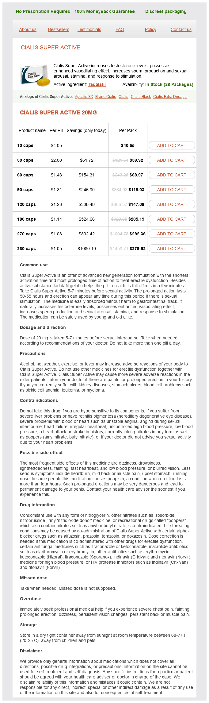 Cialis Super Active packs: 10 caps, 30 caps, 60 caps, 90 caps, 120 caps, 180 caps, 270 caps, 360 caps