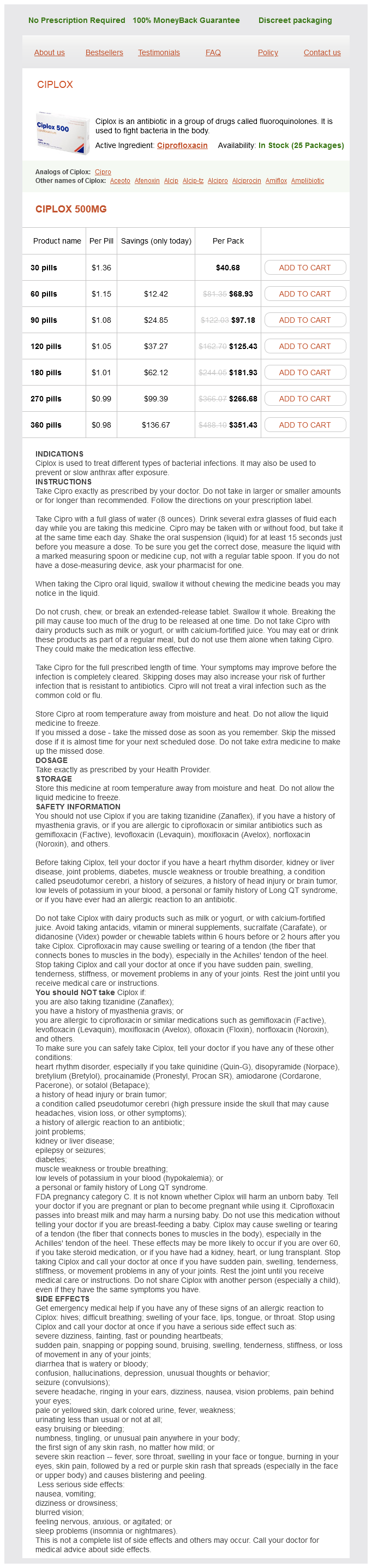 Ciplox packs: 30 pills, 60 pills, 90 pills, 120 pills, 180 pills, 270 pills, 360 pills