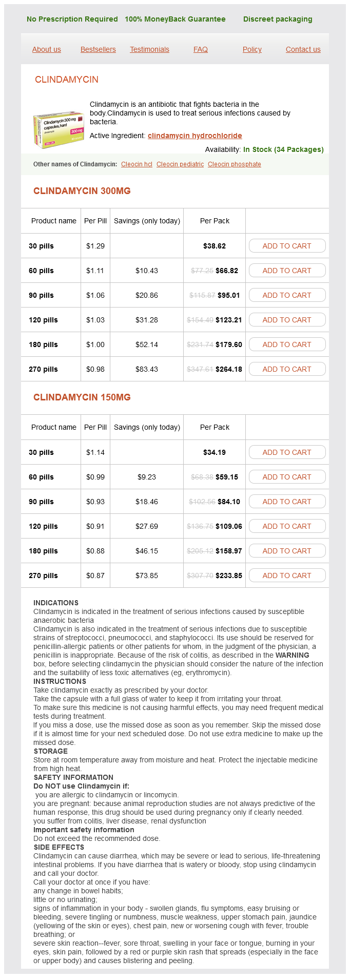 Clindamycin packs: 30 pills, 60 pills, 90 pills, 120 pills, 180 pills, 270 pills
