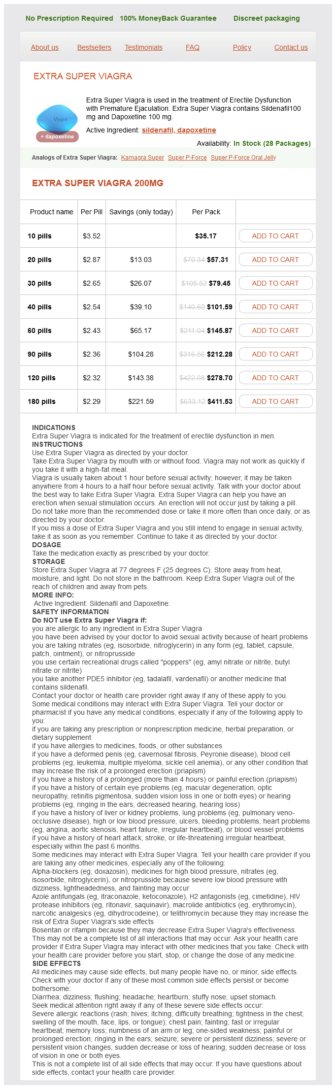 Extra Super Viagra packs: 10 pills, 20 pills, 30 pills, 40 pills, 60 pills, 90 pills, 120 pills, 180 pills