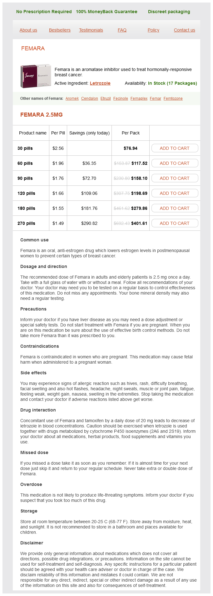 Femara packs: 30 pills, 60 pills, 90 pills, 120 pills, 180 pills, 270 pills