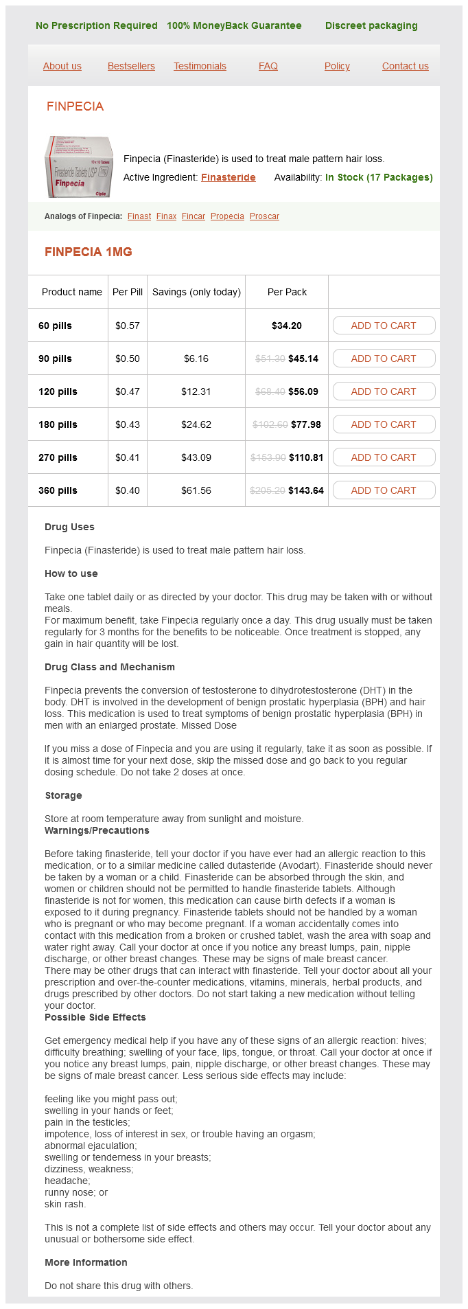 The major toxicity of irinotecan is diarrhea hair loss 30 year old man buy finpecia 1 mg with mastercard, which can occur both early and late in therapy. The late diarrhea seen in a larger percent of patients occurs 7 to 14 days after the irinotecan infusion. Health care practitioners have to be diligent in counseling patients on this adverse reaction and counseling them on the proper use of antidiarrheals. At the first change in bowel habits, an intensive loperamide regimen should be started by patients (4 mg initially followed by 2 mg every 2 hours until diarrhea free for 12 hours). If diarrhea does not stop or if it worsens, patients should be instructed to call their health care provider immediately. Lateonset diarrhea may require hospitalization or discontinuation of therapy, and fatalities have been reported. Additional toxicities with irinotecan include leukopenia (including neutropenic fever) and moderate nausea and vomiting. Toxicities of irinotecan appear to be greater when the drug is given weekly compared with other administration schedules. This test may assist health care providers in predicting which patients may develop severe toxicities from "normal" doses of irinotecan and can be ordered before patients receive irinotecan. These acute neuropathies occur in almost all patients to some degree and are exacerbated by exposure to cold temperature or cold objects. Health care providers should instruct patients to avoid cold drinks, avoid use of ice, and cover skin before exposure to cold or cold objects. In addition, carbamazepine, gabapentin, amifostine, and calcium and magnesium infusions have been used to both prevent and treat oxaliplatin-induced neuropathies, although use of these agents is not widely accepted. Patients may receive predefined breaks from oxaliplatin to decrease the onset of these toxicities with reinitiation of therapy. Maintenance therapy with another agent is usually administered and then the oxaliplatin-based regimen is restarted based on the protocol. These neuropathies occur in up to half of patients receiving oxaliplatin but usually resolve with dosage reductions or after oxaliplatin is stopped. Bevacizumab is not effective alone and must be used in combination with other agents effective in colorectal cancer. Adverse effects associated with bevacizumab include hypertension, which is common but easily managed with oral antihypertensive agents. Thrombotic events (including myocardial infarctions, pulmonary embolisms, and deep vein thrombosis) occur more frequently in the elderly patients with cardiovascular risk factors and need to be monitored carefully. Because bevacizumab interferes with normal wound healing, it should not be given shortly before or after surgical procedures. Patients who have developed 2+ protein on the urinalysis require additional testing before receiving therapy. Therapy is interrupted if urine protein excretion exceeds 2 g/24 hours or more and resumed when urine protein excretion decreases to less than 2 g/24 hours.