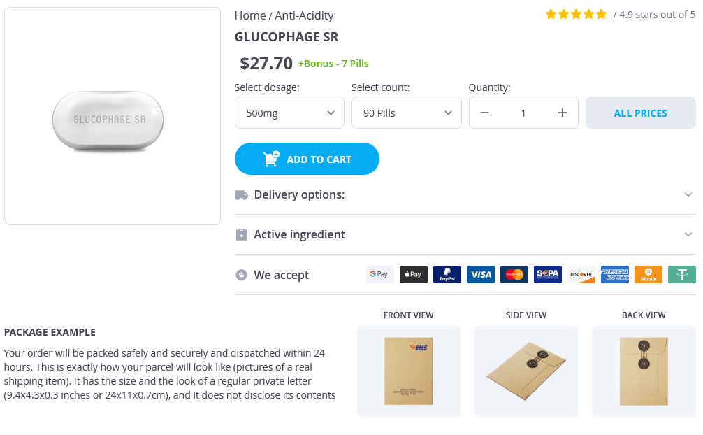 Glucophage SR packs: 90 pills, 120 pills, 180 pills, 240 pills, 360 pills