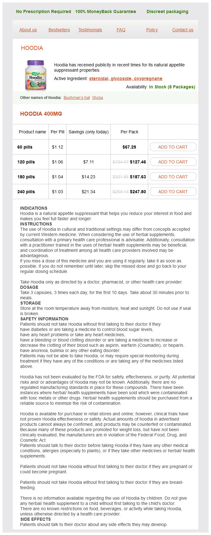 Hoodia packs: 60 pills, 120 pills, 180 pills, 240 pills