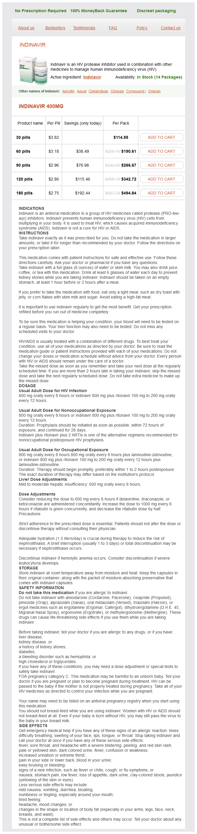 Indinavir packs: 30 pills, 60 pills, 90 pills, 120 pills, 180 pills