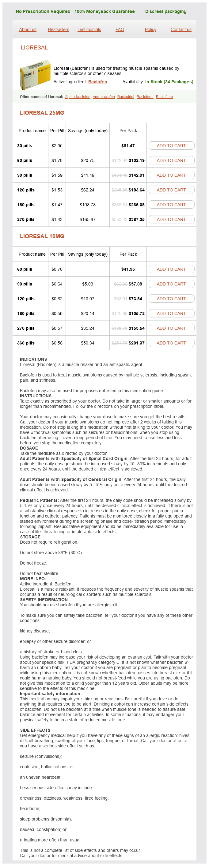Lioresal packs: 30 pills, 60 pills, 90 pills, 120 pills, 180 pills, 270 pills, 360 pills