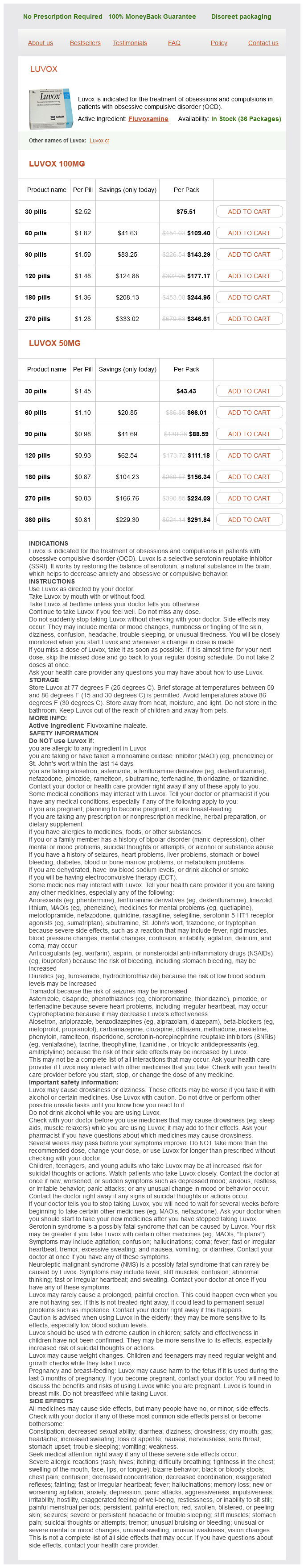 Luvox packs: 30 pills, 60 pills, 90 pills, 120 pills, 180 pills, 270 pills, 360 pills