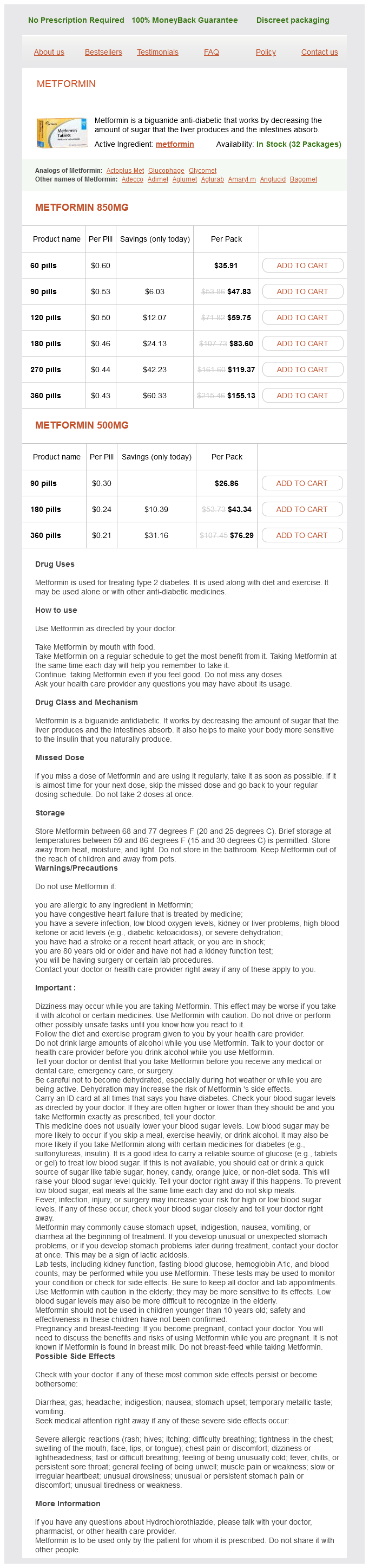 Metformin packs: 60 pills, 90 pills, 120 pills, 180 pills, 270 pills, 360 pills