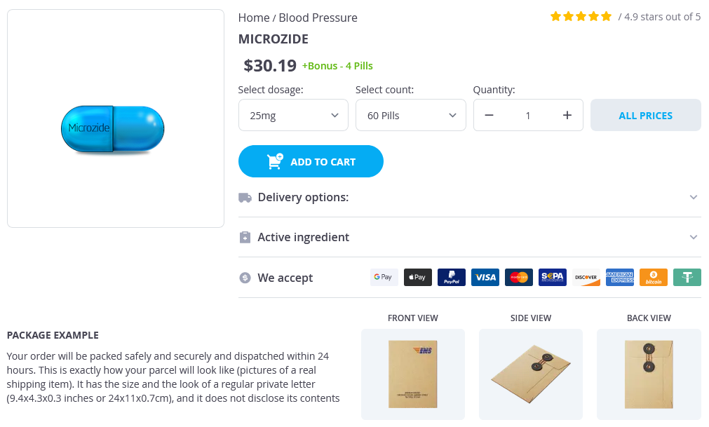 Microzide packs: 60 pills, 90 pills, 120 pills, 180 pills, 270 pills, 360 pills