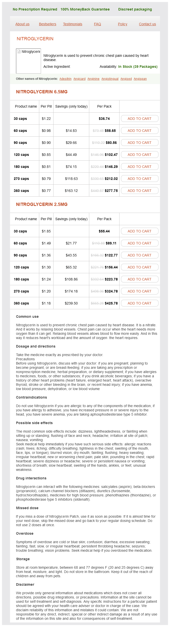 Nitroglycerin packs: 30 caps, 60 caps, 90 caps, 120 caps, 180 caps, 270 caps, 360 caps