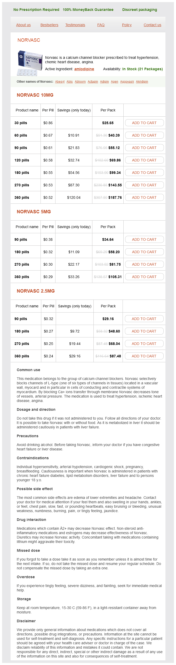 Norvasc packs: 30 pills, 60 pills, 90 pills, 120 pills, 180 pills, 270 pills, 360 pills