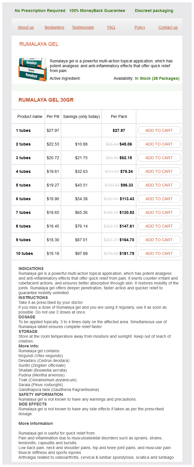 Rumalaya gel packs: 1 tubes, 2 tubes, 3 tubes, 4 tubes, 5 tubes, 6 tubes, 7 tubes, 8 tubes, 9 tubes, 10 tubes