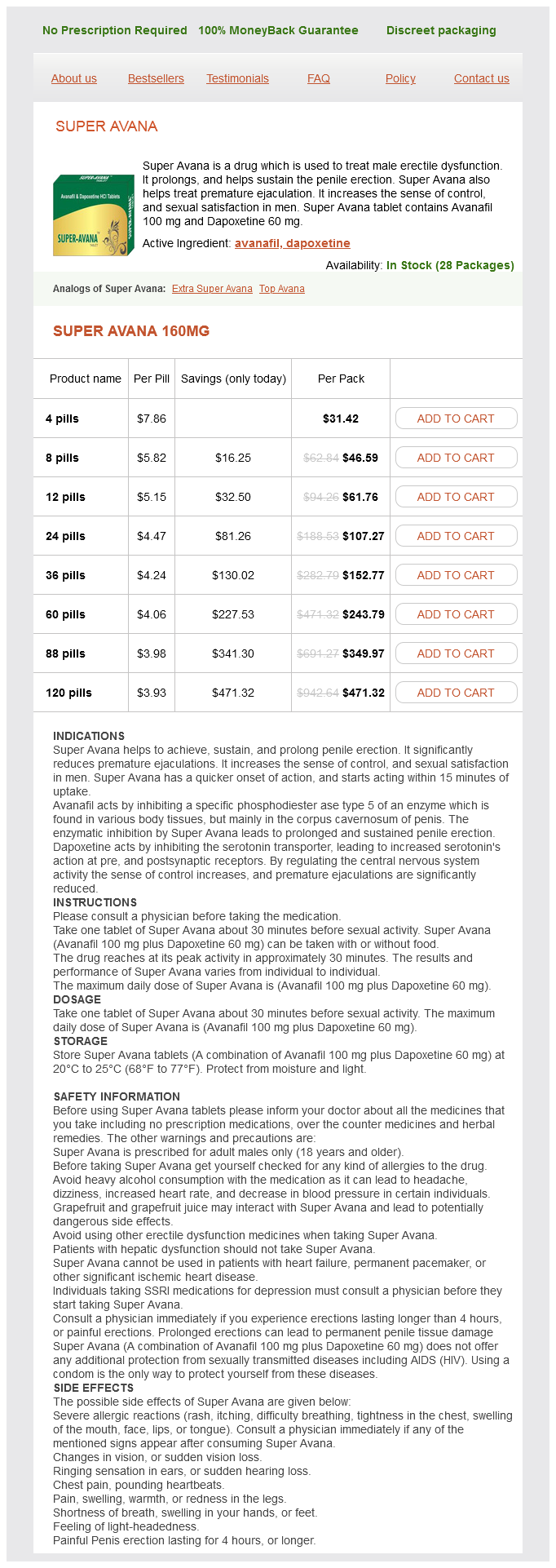Super Avana packs: 4 pills, 8 pills, 12 pills, 24 pills, 36 pills, 60 pills, 88 pills, 120 pills