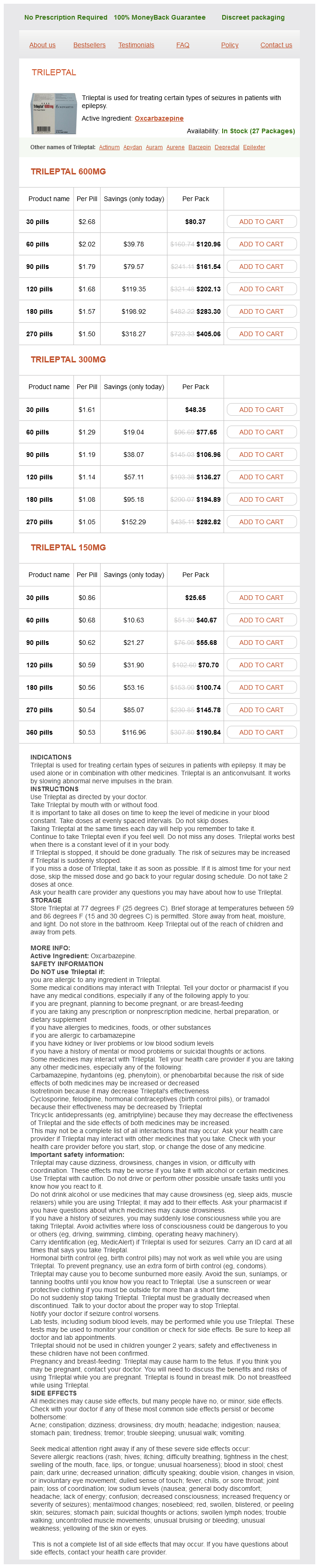 Trileptal packs: 30 pills, 60 pills, 90 pills, 120 pills, 180 pills, 270 pills, 360 pills