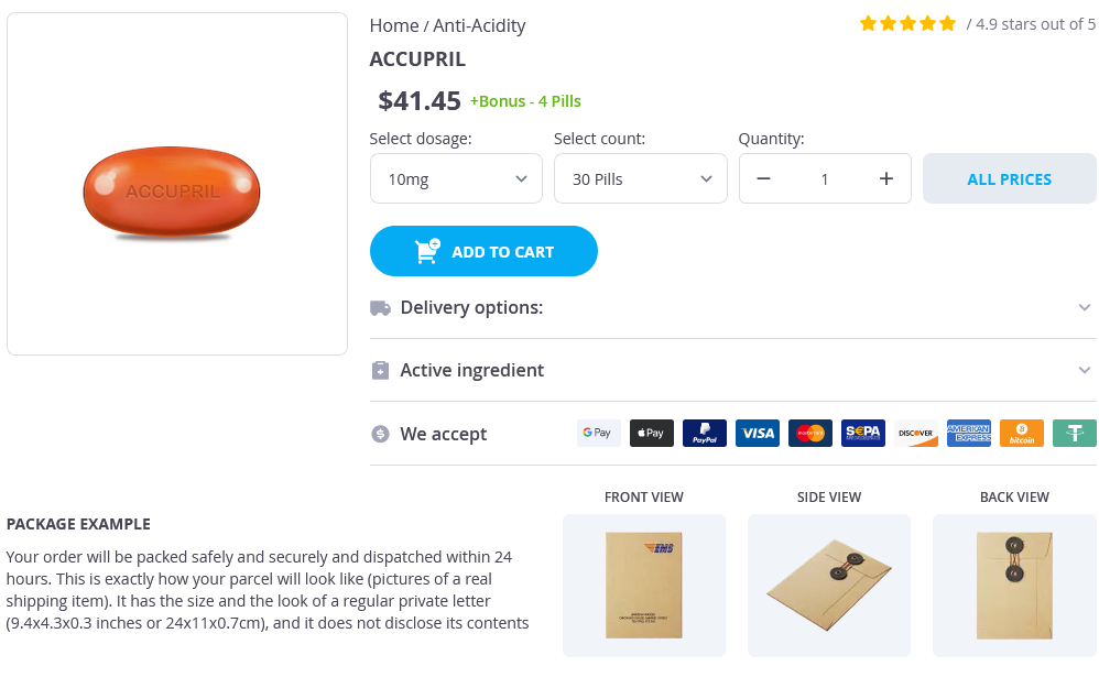 Accupril packs: 30 pills, 60 pills, 90 pills, 120 pills