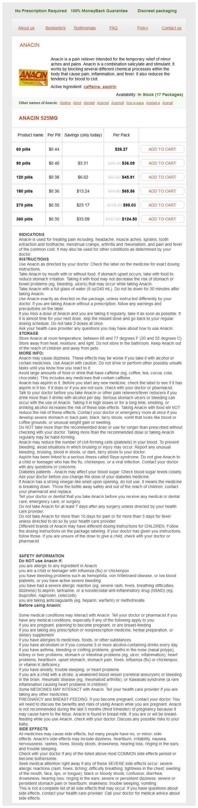 Primary antiphospholipid syndrome presenting as chronic thromboembolic pulmonary hypertension pain medication for shingles pain anacin 525 mg line. Pulmonary hypertension in a murine model of the acquired immunodeficiency syndrome dna pain treatment center 525 mg anacin order otc. Neutrophil elastase is produced by pulmonary artery smooth muscle cells and is linked to neointimal lesions pain medication for dogs with ear infection anacin 525 mg buy low price. Absence of T cells confers increased pulmonary arterial hypertension and vascular remodeling pain treatment guidelines purchase generic anacin canada. Localization of the gene for familial primary pulmonary hypertension to chromosome 2q31-32 pain medication for dogs with tumors buy discount anacin 525 mg line. Primary pulmonary hypertension: a case report including electronmicroscopic study. Pulmonary artery adventitial changes and venous involvement in primary pulmonary hypertension. Epigenetic regulation of the endothelial nitric oxide synthase gene in persistent pulmonary hypertension of the newborn rat. Fibroblast growth factor mediates hypoxiainduced endothelin-a receptor expression in lung artery smooth muscle cells. Development of Crotalaria pulmonary hypertension: hemodynamic and structural study. Pulmonary toxicity of monocrotaline differs at critical periods of lung development. Altered elastin and collagen synthesis associated with progressive pulmonary hypertensin induced by monocrotaline. Epidermal growth factor receptor blockade mediates smooth muscle cell apoptosis and improves survival in rats with pulmonary hypertension. Vascular endothelial growth factor coordinates proper development of lung epithelium and vasculature. Gene therapy targeting survivin selectively induces pulmonary vascular apoptosis and reverses pulmonary arterial hypertension. Long-term treatment with a Rho-kinase inhibitor improves monocrotaline-induced fatal pulmonary hypertension in rats. A role for potassium channels in smooth muscle cells and platelets in the etiology of primary pulmonary hypertension. Pulmonary arterial hypertension is linked to insulin resistance and reversed by peroxisome proliferator-activated receptor-gamma activation. Currently, diseases are grouped according to similar pathology, pathophysiology, and treatment. In particular, the adult classification does not include abnormalities of alveolar growth and development nor does it account for many of the syndromes seen in pediatric practice, such as Down syndrome. Group 5 consists of miscellaneous disorders that do not fit well into Groups 1 to 4. Due to the difficulties of applying the Dana Point Classification to children, a working group of the Pulmonary Vascular Research Institute developed a unique pediatric classification (Table 67. Other clinical symptoms may include seizures, hemoptysis, chest pain, dizziness, syncope, arrhythmias, or in advanced disease, symptoms of right heart failure, for example, facial edema. In contrast, syncope is a rare presenting symptom in patients with Eisenmenger syndrome. In infants, symptoms are less specific and may involve poor appetite, failure to thrive, lethargy, diaphoresis, tachypnea, tachycardia, and irritability (10-12). Asymmetric lung volumes may suggest either pulmonary arterial or pulmonary venous abnormalities. A unilateral small lung may be seen in unilateral "absence" of a pulmonary artery, scimitar syndrome, or unilateral congenital absence of pulmonary veins. However, the sensitivity is likely higher, especially in combination with a complete physical examination. The chest radiograph may show variable peripheral lung fields, depending on the amount of pulmonary blood flow. The presence of a pericardial effusion is rare in children, but when present, suggests a poor prognosis (27,31). Impedance incorporates the sum of total compliance and resistance of the vascular bed (33-36). Most young children require anesthesia for this procedure, which is an important consideration. The left marker represents the peak early diastolic velocity and the right marker represents the end diastolic velocity of the pulmonary insufficiency Doppler curve. There were no significant adverse events, such as syncope, chest pain, or dizziness, and the study was stopped for fatigue in 53% of patients, leg fatigue in 23%, dyspnea in 21 %, and miscellaneous reasons in 3% (49). It is uncertain if the same definition of vasoreactivity should be applied for adults and children (see Therapy section). Data are shown as histograms and box-and-whiskers plots illustrating the median, 25th and 75th percentile as well as 5th and 95th percentile. Measurements must be obtained when the patient is closest to his/her usual hemodynamic and metabolic state and with a normal pH. Acute vasodilator testing is essential at the baseline diagnostic catheterization to assist in determining the optimal therapeutic regimen, and is described in a subsequent section. Severe hypoxemia is not usually present unless there is either intracardiac shunting via a patent foramen ovale or an open congenital heart defect in patients with Eisenmenger syndrome or severely depressed cardiac output with resultant mixed venous hypoxemia in both conditions. Approximately, 5% to 20% of children with idiopathic disease may have an elevation of antinuclear antibodies as well as evidence of hypothyroidism or hyperthyroidism suggesting an autoimmune association (59-62). Furthermore, children should be screened for evidence of a hypercoagulable state as some may have an underlying coagulopathy such as antiphospholipid antibody syndrome or a lupus anticoagulant. The evaluation should include a liver ultrasound in cases suspected of having portopulmonary hypertension. Many children with genetic syndromes, and in particular Down syndrome, routinely have aspiration. Silent aspiration is of particular concern, as these children do not always cough during aspiration events. In general, treatment of r