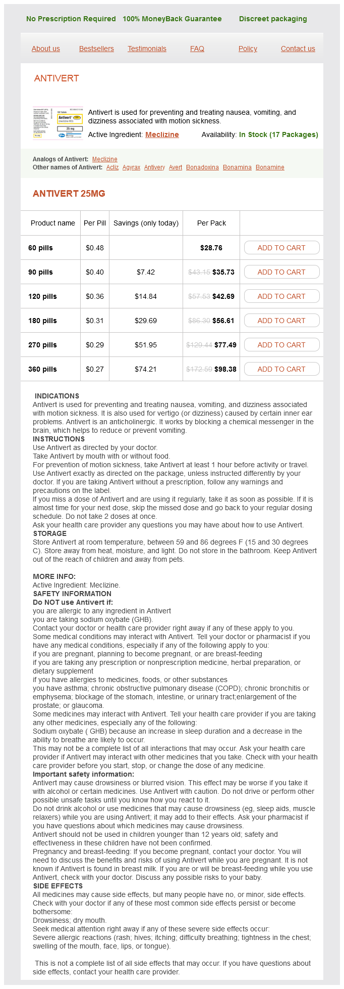 Antivert packs: 60 pills, 90 pills, 120 pills, 180 pills, 270 pills, 360 pills