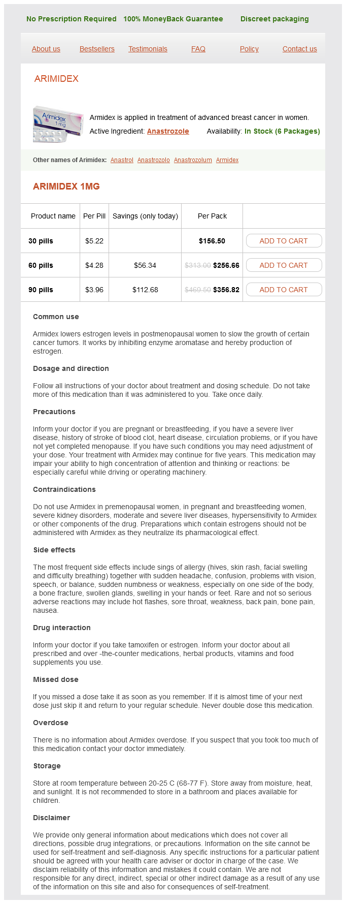 Arimidex packs: 30 pills, 60 pills, 90 pills