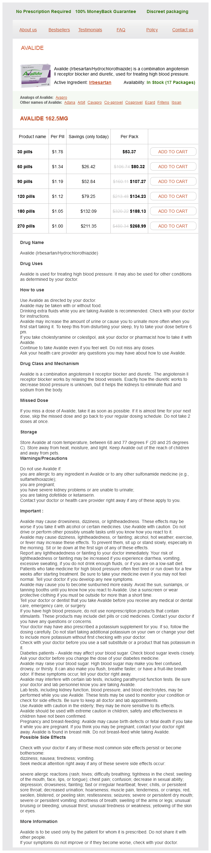 Avalide packs: 30 pills, 60 pills, 90 pills, 120 pills, 180 pills, 270 pills