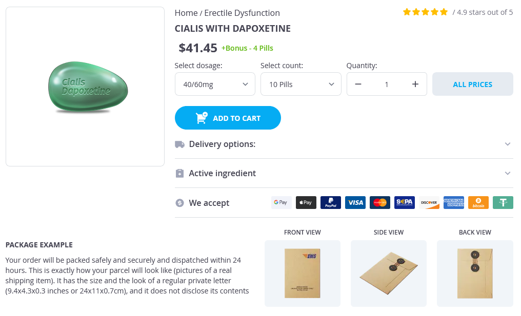 Cialis with Dapoxetine packs: 10 pills, 30 pills, 90 pills, 120 pills, 180 pills