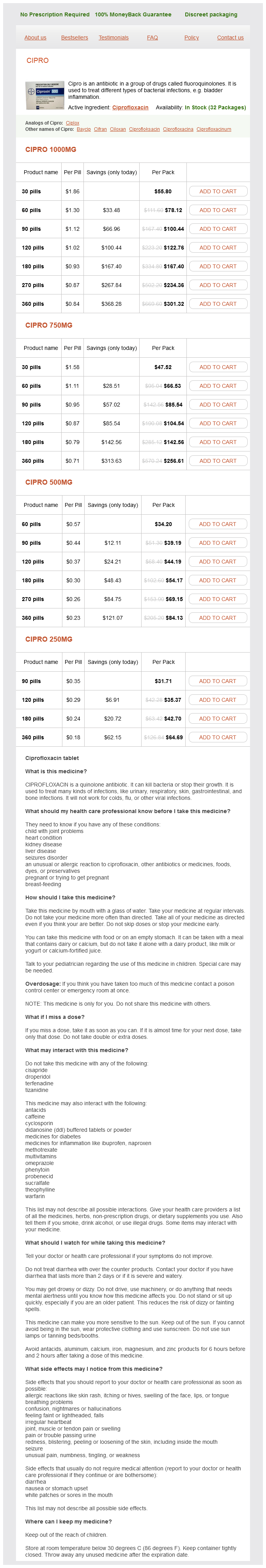 Cipro packs: 30 pills, 60 pills, 90 pills, 120 pills, 180 pills, 270 pills, 360 pills