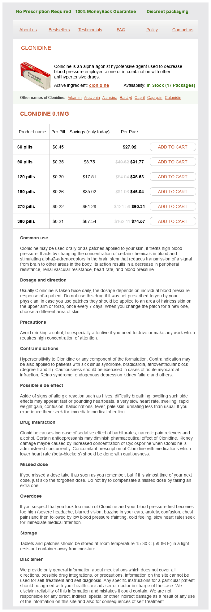 Clonidine packs: 60 pills, 90 pills, 120 pills, 180 pills, 270 pills, 360 pills