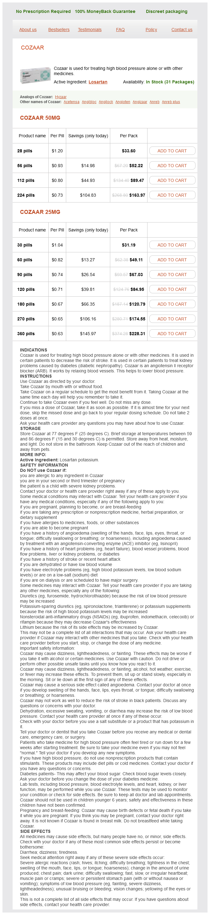 Cozaar packs: 28 pills, 56 pills, 112 pills, 224 pills, 30 pills, 60 pills, 90 pills, 120 pills, 180 pills, 270 pills, 360 pills