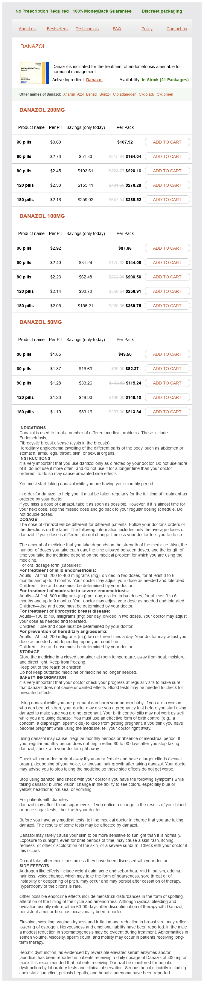 Danazol packs: 30 pills, 60 pills, 90 pills, 120 pills, 180 pills