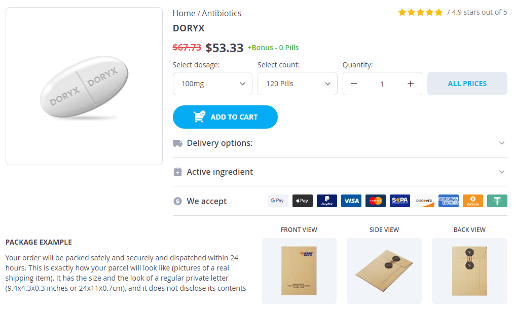 Doryx packs: 60 pills, 120 pills, 240 pills, 300 pills