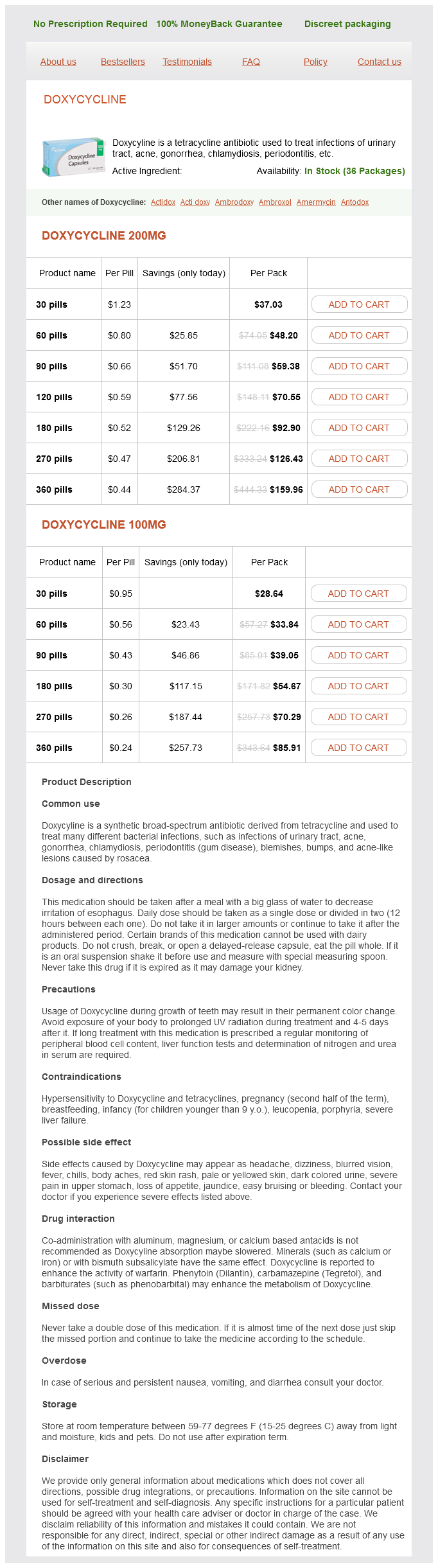 Doxycycline packs: 30 pills, 60 pills, 90 pills, 120 pills, 180 pills, 270 pills, 360 pills