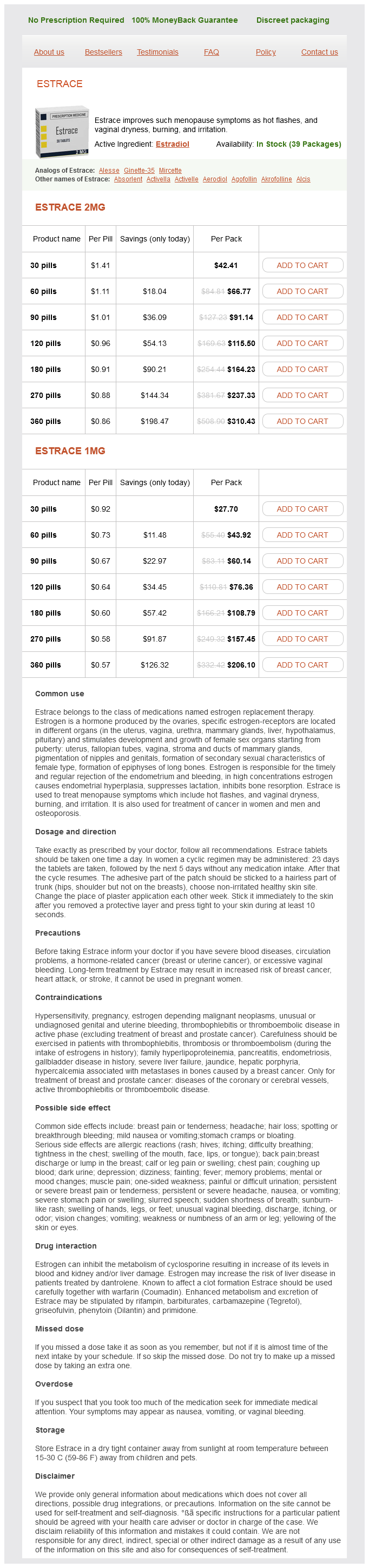 Estrace packs: 30 pills, 60 pills, 90 pills, 120 pills, 180 pills, 270 pills, 360 pills