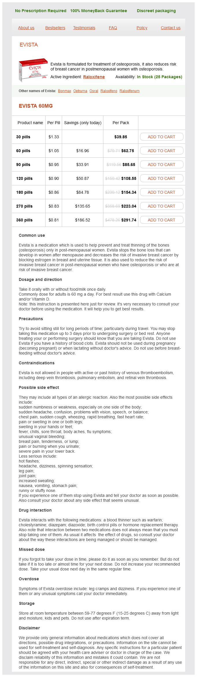 Most shellfish remain toxic for several weeks after a bloom subsides breast cancer charities buy 60 mg evista visa, although some shellfish species menopause cold flashes order cheap evista on line, including butter clams breast cancer awareness clothing order generic evista on line, may retain toxicity for more than a year women's health clinic utah evista 60 mg purchase online. In four patients who died menstruation occurs when order 60 mg evista otc, neuropathologic studies demonstrated neuronal necrosis and loss, predominantly in the hippocampus and amygdala. Domoic acid has been identified in the marine food web in multiple locations in the United States, including the Monterey Bay and Puget Sound areas. Elevated levels of domoic acid have been linked to neurologic illness and death in seabirds and sea lions24 in these areas, possibly in relation to consumption of shellfish or anchovies. However, a study in subsistence shellfish eating by Native American tribes in the Puget Sound area revealed that during years when high domoic acid levels were present in shellfish, infants born to shellfish-eating mothers had a significantly lower score on the Mental Developmental Index than did infants born in other years. Ingestion of shellfish containing the toxin causes nausea and vomiting, as well as circumoral paresthesias and paresthesias of the extremities. In more severe cases, patients may report ataxia, slurred speech, dizziness, and, in rare cases, mild respiratory distress. The Florida Department of Health and other health authorities regularly monitor coastal areas for the presence of K. Data on occurrence of the organism in Florida waters are posted on the website of the Florida Department of Health myfwc. Subsequent studies demonstrated that the implicated shellfish were contaminated not with okadaic acid (the cause of diarrhetic shellfish poisoning) but with what is now known as azaspiracid, a class of toxins linked with dinoflagellates in the genus Azadinium (and possibly other related dinoflagellates in Amphidomataceae). Symptoms include diarrhea, nausea, vomiting, and abdominal pain (which may be quite severe). Although okadaic acid appears to be the primary toxin responsible for the observed clinical syndrome, other toxic compounds have been isolated from these species. Although case reports came initially from Japan, diarrhetic shellfish poisoning has now been reported from multiple locations in Europe, Asia, South America, and South Africa, with case reports from the North American continent. Cyanobacterial species can produce thick, foul-smelling, high-biomass blooms (triggered, in many instances, by increasing nutrient flows) that have been linked to human illness, animal mortality, and adverse ecosystem and economic effects in the United States and worldwide. Microcystins, produced by cyanobacterial Microcystis species, are known to have toxic effects in animals; however, in a limited study of human recreational exposure to high microcystin levels in a small lake, no immediate human health effects were identified. On neuropsychological testing several months after the acute intoxication, patients were found to have severe antegrade memory deficits with relative preservation of other cognitive functions; patients also had clinical and electromyographic evidence of pure motor or Pfiesteria was first isolated during the early 1990s as a suspected cause of massive fish killings in the New River and Albemarle-Pamlico estuarine system of North Carolina, with respiratory symptoms, rashes, and problems with cognition being reported among laboratory personnel working with the microorganism. No further outbreaks or cases have been reported, and, in the absence of identification of a toxin or other laboratory confirmation, questions remain about the role of Pfiesteria species in the observed symptoms. Virgin Islands has not increased over a 30 year time period despite rising seawater temperatures. Assessing the incidence of ciguatera fish poisoning with two surveys conducted in Culebra, Puerto Rico, during 2005-2006. The effect of natural disturbances, reef state, and herbivorous fish densities on ciguatera poisoning in Rarotonga, southern Cook Islands. Revisiting the association between sea surface temperature and the epidemiology of fish poisoning in the South Pacific: reassessing the link between ciguatera and climate change. Harmful marine phytoplankton and shellfish toxicity: potential consequences of climatic change. Ciguatera fish poisoning and sea surface temperatures in the Caribbean Sea and the West Indies. Global distribution of ciguatera causing dinoflagellates in the genus Gambierdiscus. Neurologic sequelae of domoic acid intoxication due to ingestion of contaminated mussels. Pathology of domoic acid toxicity in California sea lions (Zalophus californianus). Potential health risks of domoic acid exposure to native American infants/toddlers and children in the Pacific Northwest: a pilot study [abstract]. Azaspiracid shellfish poisoning: a review on the chemistry, ecology, and toxicology with an emphasis on human health impacts. Recreational exposure to low concentrations of microcystins during an algal bloom in a small lake. Health effects of recreational exposure to Moreton Bay, Australia, waters during a Lyngbya majuscula bloom. Learning and memory difficulties after environmental exposure to waterways containing toxin-producing Pfiesteria or Pfiesteria-like dinoflagellates. Maguire* the helminthiases are among the most prevalent infections in the world and a leading cause of morbidity, particularly in low-income and resource-constrained regions. Leeches, ectoparasites belonging to the phylum Annelida (segmented worms), are not discussed here (see Chapter 293). Some helminths are exclusively or primarily human parasites, whereas others parasitize both humans and various other mammals, and others are parasites of lower mammals and infect human beings incidentally. Helmin