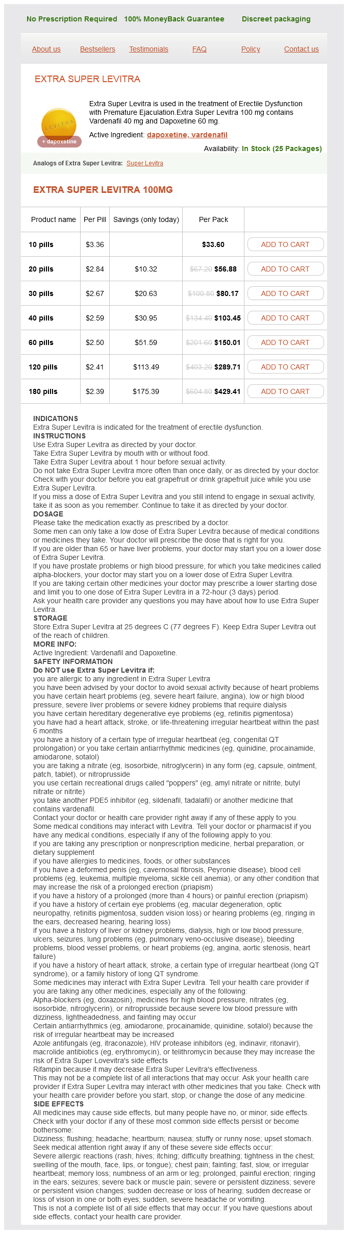 Extra Super Levitra packs: 10 pills, 20 pills, 30 pills, 40 pills, 60 pills, 120 pills, 180 pills