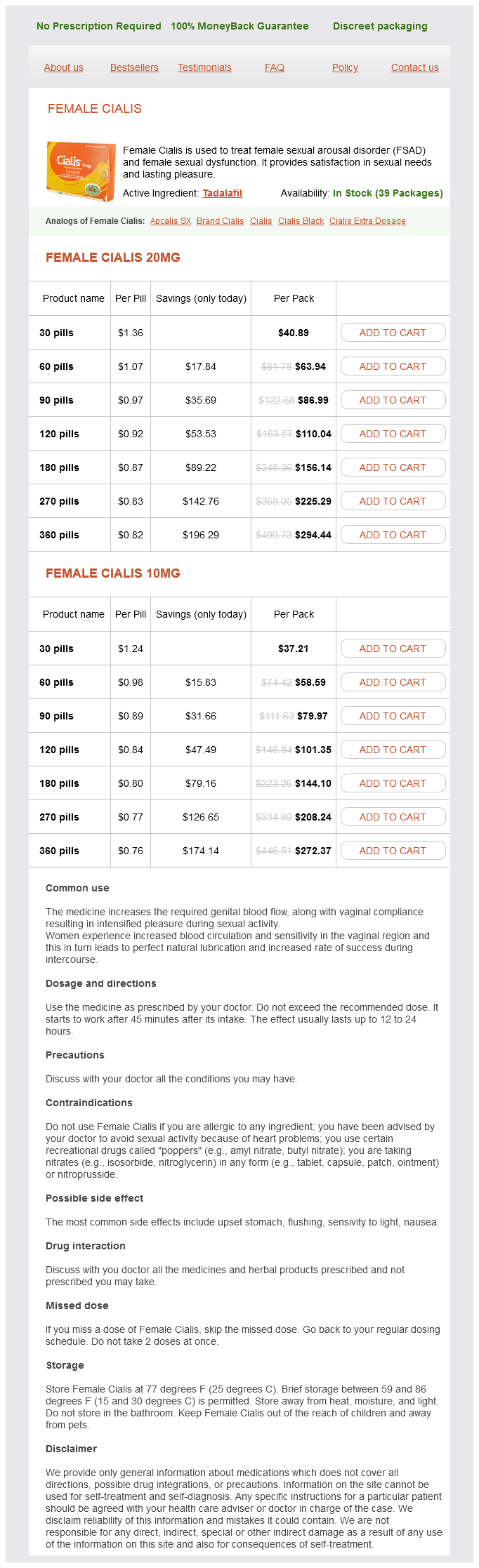 Female Cialis packs: 30 pills, 60 pills, 90 pills, 120 pills, 180 pills, 270 pills, 360 pills