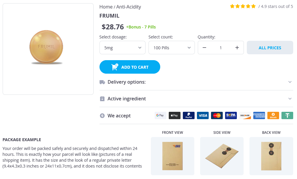 Frumil packs: 100 pills, 200 pills, 300 pills