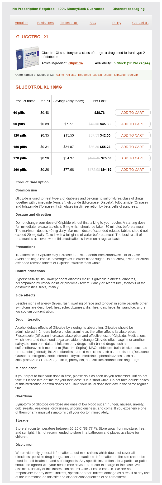 If in 12 days diabetes insipidus lupus buy glucotrol xl 10 mg low cost, the weight continues to rise diabetes vision glucotrol xl 10 mg buy low price, a clinic visit is immediately warranted diabetes medications erectile dysfunction buy glucotrol xl online pills. Oral potassium (~2040 mEq per day) may need to be supplemented diabetes type 1 juicing discount glucotrol xl 10 mg buy online, particularly if the patient is not receiving an aldosterone antagonist diabetes medications erectile dysfunction order glucotrol xl visa. Patients requiring high doses of potassium are often magnesiumdeficient and should receive magnesium supplementation. Digoxin Digoxin has the unique property of combining a mildly positive inotropic action with a negative chronotropic action, making it the only positive inotrope that does not increase mortality. Therefore, once digoxin is started, it should not be withdrawn unless toxicity occurs. Digoxin level monitoring should be performed in the latter patients, and everyotherday dosing considered. Digoxin level monitoring is encouraged in all patients, once steady state is achieved (~2 weeks after digoxin initiation). This is even more important in cases of renal failure, female sex, drug interactions, or suspicion of toxicity. Digoxin halflife is ~36 hours, so digoxin effects are expected to last ~4 days after discontinuation. Digoxin Fab antibodies (DigiFab) are indicated for bradyarrhythmias or tachyarrhythmias associated with hemodynamic instability. DigiFab binds to digoxin and then is slowly excreted by the kidneys (halflife 1520 hours, more prolonged with renal failure). After DigiFab administration, the serum digoxin level remains high or higher for several days and is no longer meaningful. It leads to immediate improvement of symptoms, then reverse remodeling within months. Exercise training improves vascular function, muscular O2 extraction, and symptoms. Iron deficiency impairs myocardial and musculoskeletal metabolism, even in the absence of anemia. Heart Failure · · · · Low peak oxygen consumption on exercise testing (<14 ml/min/kg). Longacting nitrate may also be considered as an additional decongestive measure, particularly in patients who appear euvolemic on exam. For patients recruited from American countries, spironolactone was associated with a 26% reduction of cardiovascular mortality (from ~5% to 3. Vascular dysfunction is characterized by abnormal arterial compliance, arterial vasoconstriction, and venoconstriction, and is currently viewed as a central abnormality in many cases of acute heart failure. This explains the precipitous blood pressure fall commonly seen with initiation of diuresis. Besides which, the impaired vascular compliance leads not only to a sudden blood pressure rise with a slight volume change but also to a sudden blood pressure fall. While vasodilatation increases stroke volume of the failing heart, excessive vasodilatation, seen sometimes in patients who get intubated and sedated, may not be matched by enough rise in cardiac output, as the cardiac reserve is limited, which leads to precipitous hypotension. Thus, the aggressive initiation of vasodilators or multiple antihypertensive drugs on admission should be avoided until diuresis has been started. Normally, during infectious states and chronic anemia, both preload and inotropism increase, allowing cardiac output to increase and match the high metabolic demands. Profiles of acute hf: congestion without low cardiac output, congestion with low cardiac output A. A narrow pulse pressure is the most sensitive and specific finding in low stroke volume. Wet and cold: pulmonary/peripheral edema with signs of low cardiac output (~30% of the cases). In addition, volume overload, by itself, increases ventricular filling pressures and reduces myocardial perfusion and cardiac output. Along with diuresis, digoxin may be started for rate control, followed by blocker therapy after initial stabilization. Echocardiography should be obtained to assess for systolic and diastolic dysfunction, acute valvular disease, and acute segmental wall motion abnormalities suggestive of ischemia. Doses larger than 80 mg may be needed in renal failure (up to 200 mg single dose). Immediate relief is due to venodilatation and is followed by a diuretic effect that peaks at 3060 minutes and lasts ~46 hours. When the patient is euvolemic, switch to oral, lower maintenance dose of furosemide. The lack of response to dose "X" in ~3060 minutes (<500 ml of urine within 3060 minutes) means that "X" is below a patientspecific threshold dose. Frequent dosing of the threshold provides a more effective diuresis and prevents the postdiuretic sodium reabsorption that occurs during the diureticfree intervals. A drip may only be started after an effective bolus dose initiates a diuretic response, and each time the drip is uptitrated, the bolus dose is typically administered again. This dose is tailored according to: (i) the response to the first dose, and (ii) the 24hour diuresis goal (35 liters of urine). Inotropic therapy is administered and often initiates diuresis in the case of low renal flow. Thiazide diuretics attenuate the distal tubular escape from the loop diuretic effect; thus, they increase the total diuresis but do not initiate diuresis in unresponsive patients. Note that metolazone is a thiazidelike drug that works on both the proximal and distal tubules and remains effective in advanced renal failure. Other thiazide diuretics also remain effective in advanced renal failure, particularly when combined with loop diuretics. Thiazide is probably best administered 1 hour before the loop diuretic, to prevent the distal tubular reabsorption of the sodium released by the loop diuretic. It is also lower in isolated right heart failure (~1 l/day) and when the predominant manifestation is ascites. Heart Failure 119 · Hypernatremia (the urine induced by loop diuretics is halftonic, similar to 0. The loop diuretic