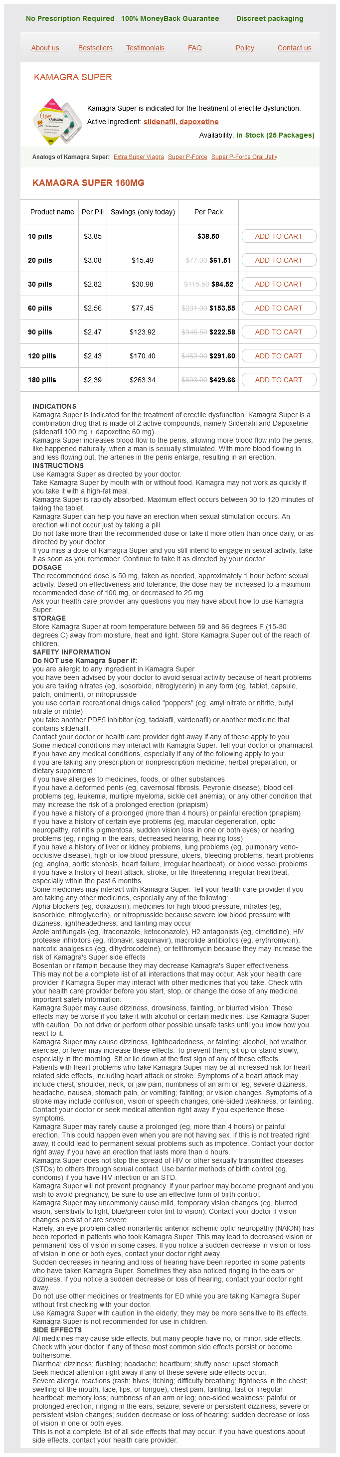 Kamagra Super packs: 10 pills, 20 pills, 30 pills, 60 pills, 90 pills, 120 pills, 180 pills