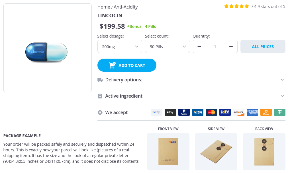 Lincocin packs: 30 pills, 60 pills