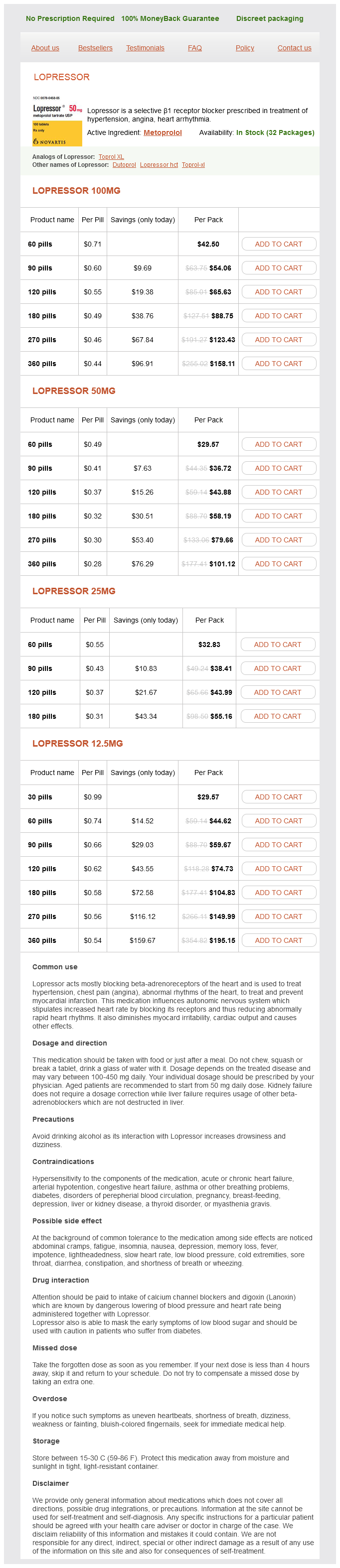 Lopressor packs: 60 pills, 90 pills, 120 pills, 180 pills, 270 pills, 360 pills, 30 pills
