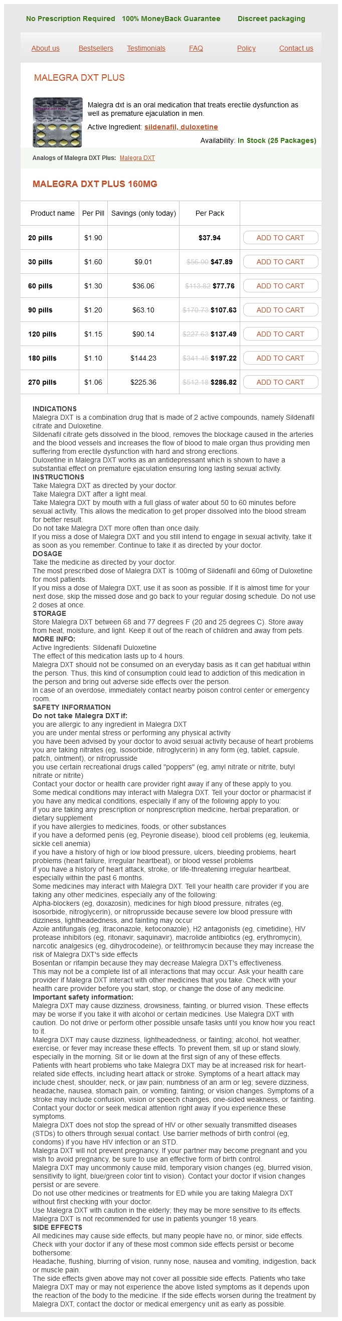 Malegra DXT Plus packs: 20 pills, 30 pills, 60 pills, 90 pills, 120 pills, 180 pills, 270 pills