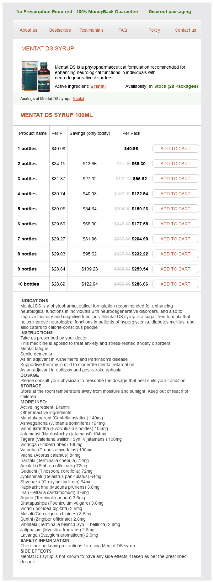 Since the advent of hepatitis A vaccines medicine used for uti cheap 100 ml mentat ds syrup with visa, infection rates have declined sharply to an estimated 2700 cases in 2011 medications narcolepsy discount mentat ds syrup 100 ml otc. Groups that are at increased risk of acquiring hepatitis A are travelers to developing countries from developed countries symptoms miscarriage cheap mentat ds syrup on line, men who have sex with men 10 medications that cause memory loss mentat ds syrup 100 ml order overnight delivery, users of injection and noninjection drugs treatment 5ths disease purchase 100 ml mentat ds syrup amex, persons with clotting factor disorders, and persons working with nonhuman primates. Individuals with chronic liver disease are at increased risk for fulminant hepatitis if a hepatitis A infection occurs. Transmission modes and response to infection vary, depending on the age at time of infection (Table 35-6). As adults, they are subject to liver disease and are at high risk of developing hepatocellular carcinoma. People have been infected by improperly sterilized syringes, needles, or scalpels and even by tattooing or ear piercing. Transmission from carriers to close contacts by the oral route or by sexual or other intimate exposure occurs. Subclinical infections are common, and these unrecognized infections represent the principal hazard to hospital personnel. The incubation period of hepatitis B is 50180 days, with a mean between 60 and 90 days. The World Health Organization estimates that about 3% of the world population has been infected, with population subgroups in Africa having prevalence rates as high as 10%. It is estimated that there are more than 170 million chronic carriers worldwide who are at risk of developing liver cirrhosis, liver cancer, or both-and that more than 3 million of them are in the United States. Its highest prevalence has been reported in Italy, the Middle East, central Asia, West Africa, and South America. Persons who have received multiple transfusions, intravenous drug abusers, and their close contacts are at high risk. In Mediterranean countries, delta infection is endemic among persons with hepatitis B, and most infections are thought to be transmitted by intimate contact. In nonendemic areas, such as the United States and northern Europe, delta infection is confined to persons exposed frequently to blood and blood products, primarily intravenous drug users and individuals with hemophilia. Delta hepatitis may occur in explosive outbreaks and affect entire localized pockets of hepatitis B carriers. Outbreaks of severe, often fulminant and chronic delta hepatitis have occurred for decades in isolated populations in the Orinoco and Amazon basins of South America. Hepatitis C Treatment Pegylated interferon combined with ribavirin has been the standard treatment for chronic hepatitis C. Antiviral therapy is given for 24 or 48 weeks, depending on the viral genotype, with cessation of therapy if sustained virologic response is unlikely to be achieved. These target the viral protease, which cleaves the translated viral polypeptide into functional proteins. These drugs have less toxicity than first-generation antivirals, and greater efficacy. Studies are ongoing to determine the effect of specific viral mutations on drug efficacy. Interferon-free treatment regimens are currently being evaluated to reduce the overall toxicity of therapy and are expected to be available shortly. Orthotopic liver transplantation is a treatment for chronic hepatitis B and C end-stage liver damage. Treatment Treatment of patients with hepatitis A, D, and E is supportive and directed at allowing hepatocellular damage to resolve and repair itself. Pegylated interferon alfa-2a, entecavir, and tenofovir are first-line therapies for hepatitis B. Resistance testing can indicate specific viral mutations that influence choice of therapy. Standard Precautions Simple environmental procedures can limit the risk of infection to health care workers, laboratory personnel, and others. Exposures that might place workers at risk of infection include percutaneous injury (eg, needlestick) or contact of mucous membrane or nonintact skin (eg, chapped, cuts, dermatitis) with blood, tissue, or other body fluids that are potentially infectious. Examples of specific precautions include the following: Gloves should be used when handling all potentially infectious materials; protective garments should be worn and removed before leaving the work area; masks and eye protection should be worn whenever splashes or droplets from infectious material pose a risk; only disposable needles should be used; needles should be discarded directly into special containers without resheathing; work surfaces should be decontaminated using a bleach solution; and laboratory personnel should refrain from mouth pipetting, eating, drinking, and smoking in the work area. Metal objects and instruments can be disinfected by autoclaving or by exposure to ethylene oxide gas. The vaccine formulated using this purified material has a potency similar to that of vaccine made from plasma-derived antigen. Preexposure prophylaxis with a commercially available hepatitis B vaccine currently is recommended by the World Health Organization, the Centers for Disease Control and Prevention, and the Advisory Committee on Immunization Practices for all susceptible, at-risk groups. The vaccines are safe, effective, and recommended for use in persons more than 1 year of age. Routine vaccination of all children is now recommended, as is vaccination of persons at increased risk, including international travelers, men who have sex with men, and drug users. Until all susceptible at-risk groups are immunized, prevention and control of hepatitis A still must emphasize interrupting the chain of transmission and using passive immunization. The appearance of hepatitis in camps or institutions is often an indication of poor sanitation and poor personal